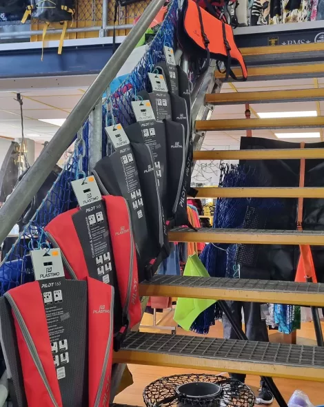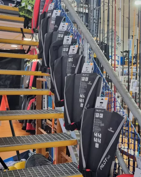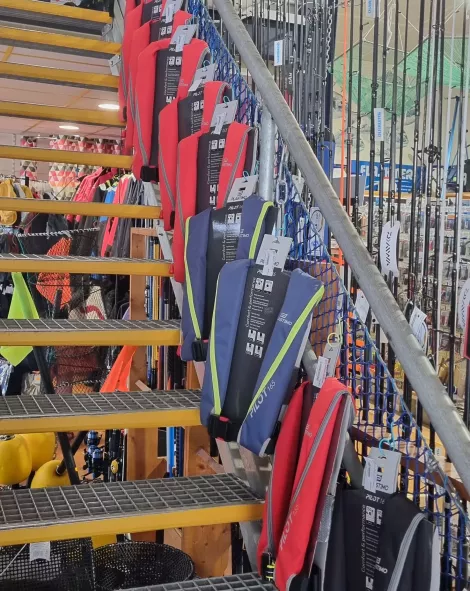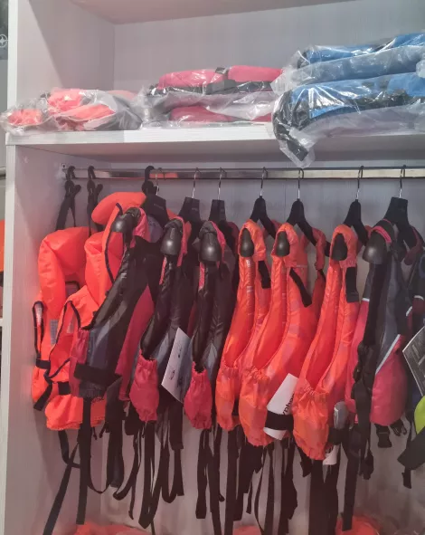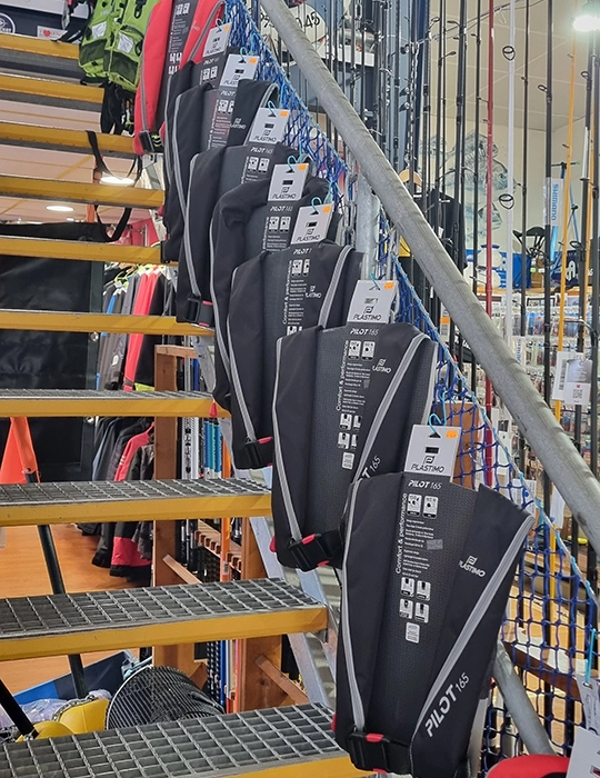 Gilets de sauvetage, gilets gonflables, gilets chiens, fusées de détresse, extincteurs, coupes circuits, lampes torches et frontales, VHF, compas...
